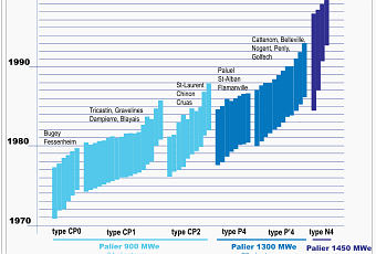 MAIS CE N’EST PAS UNE COURBE DE GAUSS / la première tranche est de 1978 et la dernière date de 2002.Admettons en première approximation que la durée de fonctionnement soit d’abord de 40 ans , IL RESTERAIT ALORS UN TEMPS DE VIE MOYEN DE 16 ANS .Un calcul « brut » nous donne 2012 +16=2028 , un calcul plus raffiné étalerait les arrêts depuis 1978+40=2018 jusqu’à 2002+40=2042 ……