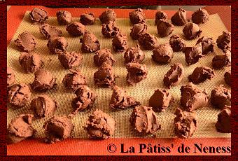 Faire fondre le chocolat au bain-marie. Pendant ce temps, former des petites boules de ganache (elle aura durcie) avec une cuillère à pommes parisiennes et une petite cuillère, les déposer dans un plat couvert de papier sulfurisé.