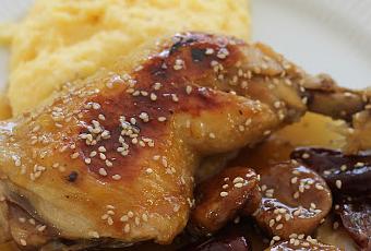 Préparez la polenta en faisant bouillir le lait salé , hors du feu ,ajoutez la polenta en pluie , faites cuire 1 minute . Ajoutez le beurre et retirez la du feu pour qu'elle soit bien crémeuse.Servez chaque morceau de poulet accompagné de polenta et de fruits secs .