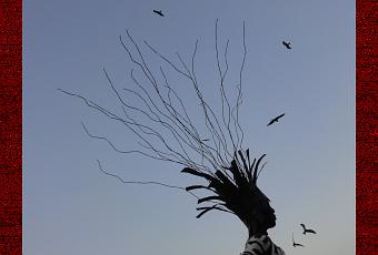 Le grand personnage aperçu de loin prend corps avec ses semblables qui sont semble-t-il rescapés d’une coque vide de navire échoué. Un rouge profond, comme maculé de sang, évoque la douleur, les crispations, les contorsions des corps et des âmes ; mais les personnages sont debout. Il s’agit de l’œuvre installée par l’artiste martiniquais, Hervé Beuze. Son propos est intitulé Bwa Brilé qui évoque à la fois ce qui est calciné, brulé jusqu’à la trame, comme un charbon de bois mais aussi ce qui semble exsangue, sans vie et qui soudain reprend forme et vitalité. Une femme majestueuse, vêtue d’écriture libre, blanche sur fond noir, est justement pleine de force triomphante, elle entraîne ces corps en lambeaux, en lamelles, bricolés, penchés, fourbus, mais debout. L’œuvre évoque les paroles d’Eugène Mona et apporte surtout en terre africaine, goréenne, une réponse de l’autre bord, un signal fort d’une présence et du retour toujours possible. La femme-écriture est dotée d’une chevelure qui se termine en voie lactée et, comme une figure de proue entrainant ses compagnons, se dresse depuis le sol d’où elle semble surgir. La nuit, les personnages prennent une dimension encore plus saisissante, la lumière vient du dedans, les âmes brûlent, incandescentes et se souviennent. On apprécie la monumentalité de ce travail qui exprime une narration actualisée du croisement des cultures, des échanges et des métissages. Figures blanches, figures noires, bois, lamelles, métal, les matériaux comme les couleurs expriment cette faculté de métamorphose qui passe du calciné à la résurgence d’une flamme nouvelle.