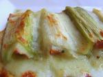 Ca pourrait très bien se manger comme ça. Tout est déjà cuit. Et la Mornay froide, c'est trop bon! Mais on va compliquer les choses. On étale donc la Mornay qui reste sur les poireaux (en fine couche) et zou, 20mn au four à 200° pendant 15mn. Après essai, il est conseillé de mettre les rouleaux dans un plat qui contienne un peu la sauce, car ça cooouule!!!