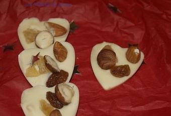 Avant que le chocolat ne durcisse, disposez selon votre choix, un morceau d'amandes, de noisettes, de fruits confits, de raisins secs.....