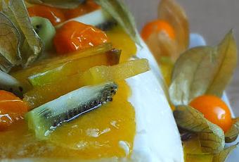 Placer la lame d'un couteau entre les bords du moule contenant le bavarois. Couper le financier en un morceau rectangulaire de la taille du moule à cake contenant le bavarois. Placer le financier sur une assiette de service, puis retourner cette assiette sur le moule contenant le bavarois. Retourner délicatement le bavarois sur l'assiette de service.Verser le coulis de mangue sur le bavarois et remettre au frais minimum 2 heures. décorer de fruits exotiques.