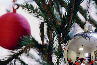 Boules de Noël rouge et grise, boules de Noël argenté et flocons Habitat # Pomme de pin et ours blanc By Nord # Planche à découper fleur Monoprix # Bougie à pois Paola Navone x Monoprix # Branche de cerisier lumineuse Nature & Découvertes # Vase Invotis Design # Présentoir Babell Koziol