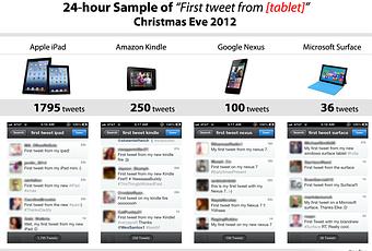C’est Andy Baio (@waxpancake) sur Twitter qui s’est amusé à faire une petite recherche sans grande prétention sur les premiers tweets suite au réveillon de Noël 2012. Rien de transcendant et surtout rien de scientifique puisque ça compte que ceux qui ont tweeté mais d’après ces recherches sur Twitter, c’est quand même l’iPad + l’iPad mini qui sort gagnant pour cette fin d’année.