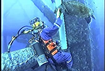 La grosse mémère carapaçonnée vient à la rencontre de cette drôle de bête qui s'incruste dans son royaume sous marin. Elle s'informe, elle vient aux nouvelles pour estimer s'il y a danger ou pas. On est du même monde tous les deux, celui des abysses, semble-t-elle signifier au scaphandrier. Et cette chose rigide qu'on a sur le dos, ces mouvement lents, cette grâce flottante et paisible, toutes ces ressemblances qui nous rassemblent font de nous comme une paire d'amis.