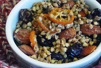 Couper les kumquats en rondelles et retirer les pépins puis mélanger avec les amandes, le sarrasin et les canneberges.