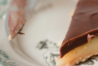 Hors du feu, la verser sur le chocolat en 3 fois et mélanger jusqu’à ce que celui-ci soit totalement fondu. Verser sur la crème de citron froide.Réserver au froid.