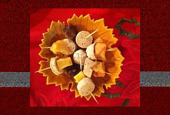• Boudin blanc : J’ai servi le boudin restant sur des pics pour l’apéritif, coupé en tranches intercalé de morceaux de pommes et de marrons que j’avais servi avec la dinde à Noël. On s’est régalé !
