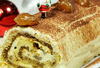 Dérouler le biscuit, l’imbiber de sirop au café avec un pinceau et le recouvrir des 3/4 de la crème mascarpone. Étaler la crème sur le biscuit avec une spatule et parsemer des morceaux de marrons glacés un peu partout dans la crème. Rouler le biscuit puis recouvrir toute la bûche avec le restant de crème.
