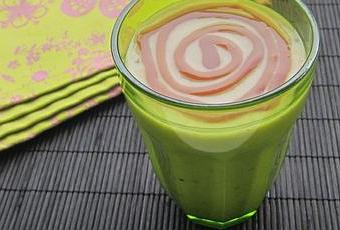 Mixer d'abord la pomme pour la réduire en purée puis ajouter le kiwi et la banane. Mixer. Ajouter les épices, le lait de soja et mixer à nouveau. Doser le lait de soja selon l'épaisseur souhaitée.