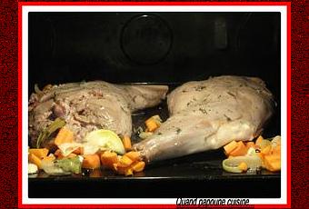 Sortir la gigue de la marinade, l'égoutter, la sécher avec du papier absorbant, la badigeonner avec un mélange d'huile et de beurre fondu et saupoudrer d'un peu de thym frais. La mettre dans 1 plat à four métallique (la viande sera mieux saisie) ou directement sur la lèche-frite, entourer avec les légumes de la marinade filtrée. Cuire 20mn par livre en arrosant avec la marinade toutes les 10 min environ.