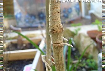 C'est en flanant dans le jardin et en m'approchant que je constate qu'il est toujours affublé de lien pour le rendre bien droit !