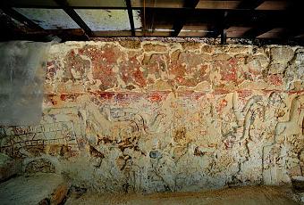 La peinture murale était masquée par un mur en pente datant du début postclassique (1000-1250 après JC).