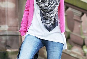 Pour pratiquer la happy face je dois admettre que je triche avec un gilet rose bubble gum. Je commence déjà à fouiner du côté des nouvelles collections, et rien ne me plait davantage que les lainages douillets du printemps ! Un peu de soie, une pointe de cachemire, ça fait de la maille ultra douce ni trop chaude ni trop encombrante (et que l’on peut même porter quand il fait froid quand on la superpose !). J’ai aussi trouvé ce foulard ethnique si long que j’ai fait un petit noeud pour pouvoir le porter comme un snood. A bientôt !