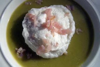 Tout le monde a aimé cette île flottante salée! On peut remplacer le bacon par du chorizo et les pois cassés par des petits pois ou des lentilles.