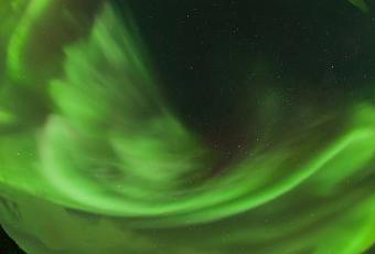 Captées à la faveur d’un ciel peu encombré de nuages et de longues journées sans Soleil, les aurores ont beaucoup dansées au-dessus de lui. Cette brume au vert fluorescent n’a de cesse de s’agiter, ondulant, s’ébrouant, enlaçant les étoiles ou léchant l’horizon glacé … C’est un flux et reflux de particules solaires ionisées lors de leur contact avec notre atmosphère, qui se tortille et se déploie, nourries par le vent solaire.