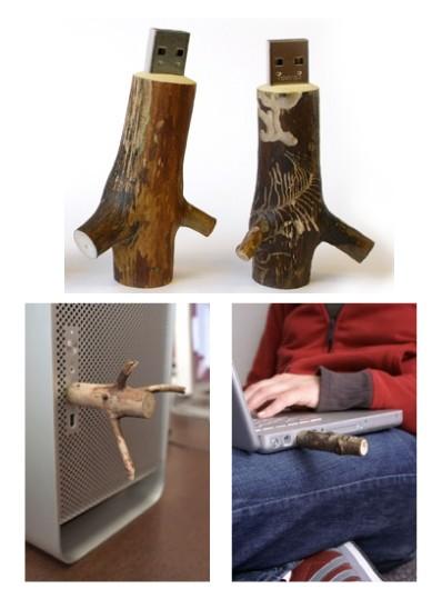 La clé USB en bout de bois n'est pas mal pour intriguer vos collègues de bureau (n'oubliez pas de mettre une chemise à carreaux pour faire bûcheron). Evidemment la chose est un peu encombrante et vous aurez du mal à brancher deux prises USB côte à côte, mais dans le TGV, cette clé en brindille est idéale pour gratter, mine de rien, la cuisse de votre voisin...