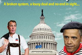 Quelques jours après le vote du compromis qui a permis d'éviter le "mur budgétaire" aux Etats-Unis mais a repoussé les dossiers les plus épineux aux prochaines semaines, le magazine titre "America turns European" ("L'Amérique vire européenne"). Et pour brocarder le président américain Barack Obama, quoi de mieux que de le déguiser en Français ?