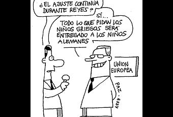 Le journaliste : La rigueur continue pendant la fête des Rois ? Le représentant de l'Union Européenne : Oui. Tout ce que les enfants grecs ont pu demander sera offert aux enfants allemands. (Traduction Denise Anne Clavilier)