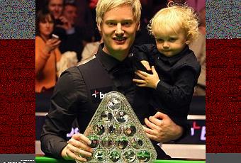 Heureux, à l'Alexandra Palace, Robertson Neil après avoir redonné ses lettres de noblesse à cet endroit magique, en ayant remporté par une brillante victoire 10-6 contre Shaun Murphy, les Masters 2012. Très belle image de Robertson et son petit garçon aux cheveux bouclés, qui accompagne son père devant le tapis de la victoire. Probablement l'une des plus regardée de l'année, étant donné cette réputation que les joueurs de billard ont, connus pour garder leur vie privée bien loin des photographes et caméras.