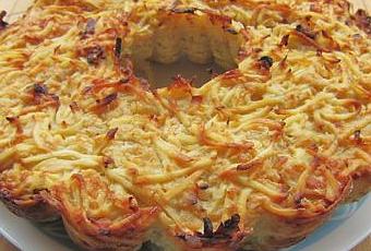 Fouetter les oeufs entiers dans une grande jatte, ajouter les pommes de terre râpées et les oignons. Saler, poivrer, ajouter de la noix de muscade. Incorporer le fromage râpé et mélanger le tout.