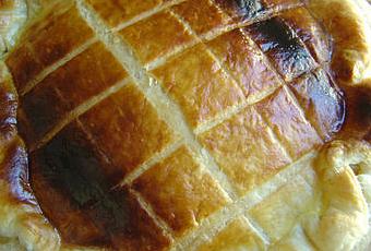 2° Etalez une pâte feuilletée dans votre moule. Versez la frangipane. N'oubliez si vous en avez une à disposition d'y glisser une fève. Déposez la seconde pâte feuilletée et refermez de façon hermétique.