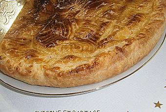 le tout bien étalé entre deux pâtes feuilletées (avec une fève) que vous soudez pour obtenir une jolie galette. 1 jaune d'oeuf pour dorer le dessus et 30 min au four à 210° (th7).à surveiller si cela cuit trop vite au dessus placer une feuille d'alu.