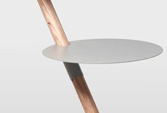 Une simplicité de fabrication, où la tige de bois est utilisé comme support pour une multitude de plaques de métal définissant des niveaux, des étages pour la table basse et table de chevet.