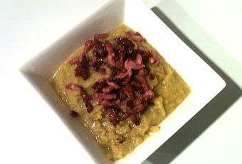 Dans une marmite, faites bouillir 1L d'eau et ajoutez 1 Kub or. Versez les petits pois et l'oignon coupé en cube et laissez cuire 8 minutes. Égouttez les en gardant le bouillon. Mixez les petits pois, au robot avec 2 louches de bouillon (si vous aimez plus liquide n'hésitez pas à ajoutez plus de bouillon ) et salez légèrement et poivrez puis réservez. Faites griller les lardons à la poêle. Dresser dans les 6 assiettes, le veloutés puis répartissez les lardons.