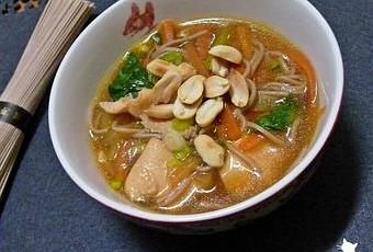 Les soba sont des pâtes fines et longues à base de farine de sarrasin (soba veut d'ailleurs dire sarrasin en japonnais) très consommées au Japon. Avec quelques légumes frais revenus au wok, du poulet mariné dans une sauce soja et un bouillon de volaille, cette soupe apporte toute la légèreté et la gourmandise attendues après une longue période de lourds repas.
