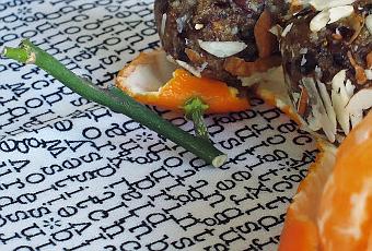 20 gr d'amandes50 gr de mûres blanches30 gr de canneberges séchées15 à 30 ml de jus de clémentine fraîchement pressé1/4 de cuillère à café de poudre de vanilleZeste d'un citron ou de deux clémentinesUne pincée de fleur de sel +15 gr d'amandes effilées au couteau pour l'enrobage