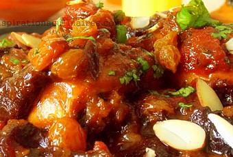 Ce tajine est accompagné d'une bonne salade de carottes à l'aigre douce. Un tajine mijoté à feu doux saupoudré en fin de cuisson de coriandre et garni d'amandes effilées.