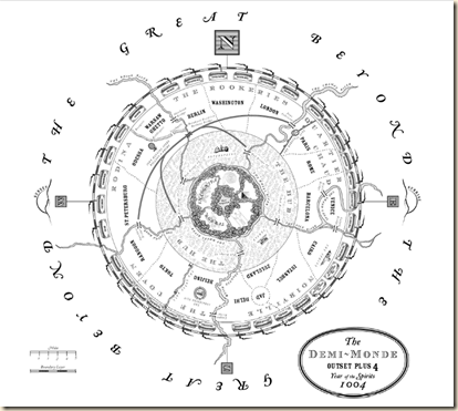 ABBA est un ordinateur qui gère un monde virtuel et accessoirement donc un dieu dans ce demi-monde.Le demi-monde c'est un condensé de notre monde réel, le tout à la sauce 1870 au niveau des technologies. On y retrouve des "pays" réduits à leur plus simple expression et chacun extrêmement typé. On y retrouve Paris, Venise, le ghetto de Varsovie, Pekin, Berlin et j'en passe. Le plus simple c'est que vous regardiez le plan ci dessous, c'est plus parlant (enfin presque ...) et en tout cas indispensable pour bien suivre l'action se déroulant dans le roman.