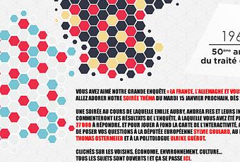 Au coeur de cette soirée, les résultats d'une enquête menée par ARTE, Radio France et DeutschlandRadio. Comment Français et Allemands appréhendent-ils les réalités de leurs voisins ? Peuvent-ils envisager un avenir commun ? Si oui, sous quelle forme ? Chacune de leur côté, les deux journalistes ont parcouru plusieurs régions en France et en Allemagne, à la rencontre d'hommes et de femmes qui évoquent ou incarnent cette amitié si souvent citée en exemple. Avec, en plateau, la politologue Ulrike Guérot, membre du Conseil européen pour les relations étrangères, le metteur en scène berlinois de la Schaubühne Thomas Ostermeier, membre du conseil franco-allemand pour la culture, et Sylvie Goulard, députée européenne, groupe Alliance des démocrates et des libéraux pour l'Europe.