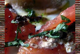Pour le service. Dans des cercles, déposer une couche de ricotta surmontée d'une couche de caviar d'aubergine. Parsemer de quartiers de tomates et des lamelles de tomates séchées. Verser un peu d'huile d'olive mélée à du vinaigre balsamique. Saler et poivrer.