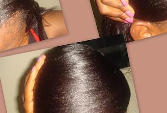 4/ Vous pouvez voir que derrière c'est encore flou. je prend donc mon petite peigne et je repasse tout autour en respectant le sens de départ sinon c 'est foutu!!! rasurez vous toujours du sens dans lequel vous avez enroulez vos cheveux!!! en relissant au peigne passe la main derriere pour harmoniser le tout...en remontant vers le milieu , très doucement, faites de petits coups (un peu comme en tire bouchon) pour lisser le milieu. Si ça devient trop compliqué, laissez tomber avec le temps vous aurez la main.