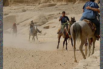 Pour commencer, Petra en Jordanie où je me trouvais en octobre 2003, à l’occasion d’un voyage professionnel en Jordanie.Une route faite de sable part de là où le taxi m’a laissé. Tout est soleil et or. Petra est dissimulé. Je sais que je le trouverai au débouché de la sente sablonneuse, qui part devant moi.Un groupe de jeunes jordaniens juchés sur leurs chevaux, dansent comme une samba. Jouent-ils ? Non pas vraiment. Ils sont là à la recherche de touristes qu’ils pourraient accompagner. Je reste un moment à les regarder, fasciné par le ballet de leurs courses. Sans raison précise, les images de Lawrence d’Arabie me reviennent. Je revois la course dans le désert, quand les cavaliers se battent pour se saisir d’un trophée.