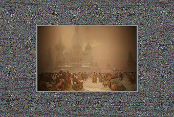 La scèneLa scène se passe en plein hiver, le 3 mars 1861 (selon le calendrier grégorien, mais le 19 février selon le calendrier julien, utilisé par les Popov jusqu'à la révolution et toujours en usage auprès de la cléricafarderie orthodoxe) sur la Place Rouge. Le ciel chargé de lourds nuages est visiblement constipé, les pauv' boug' sur la place aussi, et l'annonce de l'affranchissement ne semble pas les réjouir outre mesure. Sur la droite, l'on aperçoit le Kremlin et droit en face, sur presque 50% de la toile, la splendidement fabuleuse cathédrale de Basile le peinard. Notez qu'il s'agit de la seule et unique bâtisse réellement existante de toute l'Epopée peinte sur une toile. Tous les autres édifices représentés sur les 19 autres barbouilles ne sont que pure fiction.