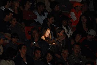 Belle image : seule dans la foule, sans doute pour poster sa photo sur un réseau social. Image insolite d'une étrange solitude peuplée de fantômes omni absents.