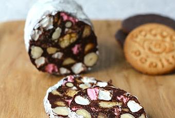 Par contre, toujours quelques douceurs au programme. Aujourd'hui je vous propose un basic super simple et déclinable selon les envies et les ingrédients disponibles dans le placard : le saucisson au chocolat.