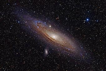 M 31 ou la galaxie d'Andromède est la plus proche spirale de la Voie Lactée, spirale elle-même. (Étant bien entendu que les deux galaxies les plus proches de la nôtre sont les naines appelées Nuages de Magellan). Alors que son aspect et sa structure paraissaient bien familiers, on vient de découvrir que bien d'autres petites galaxies entourent la grande et que cette configuration pourrait amener une redéfinition du modèle de formation des galaxies.