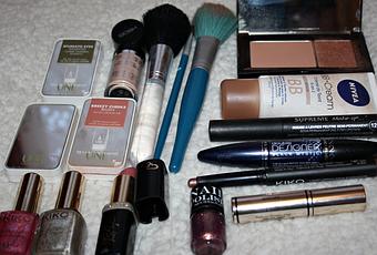 Mon entente avec le maquillage n'est que très récente, puisque petit bébé que je suis, ma peau suivait la cadence. Réaction allergique, gratouille, plaque d'eczéma, et j'en passe des pas mûres. Mais j'ai appris à apprécier les bonnes choses pour ma peau. Voici donc une sélection de tout se qui est utilisé au moins dans le mois, et tiens donc le coup dans ma trousse à maquillage (le reste, c'est encore dans des cartons sur mon bureaux). Il y a d'abord la marque UNE very gros coup de coeur, (surtout pour le rose à joue, j'en abuse) non seulement pour la qualité, mais aussi pour le design (un peu dans le style d'Apple, vous trouvez pas ?) que je trouve important ! Ma bébé crème, indispensable... j'hésite encore sur ma préférée... la Garnier, ou la Nivea.. le temps m'aidera. Du doré pour les yeux Yves Rocher, une valeur sûre ! La seule marque que je me suis toujours autorisée. Un rouge à lèvre semi-permanent acheté en pharmacie la promesse est un peu menteuse, mais j'adore la couleur. Un mascara l'Oréal 2 en 1 de MylittleBox, je l'adore, il est parfait, tellement propre. Crayon pour les yeux Kiko, toujours des paillettes et tellement pratique. Mascara Chanel, un joli échantillon que je sors de je ne sais où, mais qui en tout cas, est vraiment extra ! Rouge à lèvre L'Oréal, Eva Langoria... Je ne sais pas si c'est l'effet "même taille" avec la jolie, mais je trouve la couleur de ce rouge à lèvre superbe ! Vernis Kiko, la base de la base... en parlant vernis, présentation de ma collection, car oui, je vous un culte à toutes ces petites merveilles.