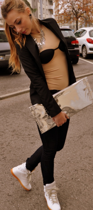Sur un coup de tête j'ai choisi les sneakers blanches en cuir très confortables, le body qui ne nous le cachons pas ne met pas du tout en valeur la poitrine, la pochette bonbon extra large et le bracelet montre.