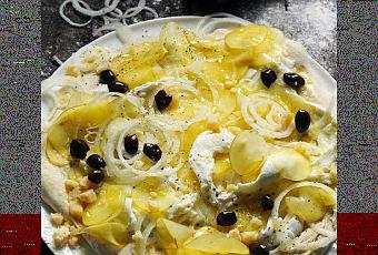 Mais des fois comme aujourd'hui, il y a conjonction pour m'empêcher de me rouler en position du castor digérant au fond de mon canapé et ne penser... à rien ! Aujourd'hui Marie ne bosse pas, la prof de philo de l'une est malade, les cars de l'autre sont en retard et le partiel de ma merveille n'est qu'à 15h… y'a conjonction quoi !Et forcément au lieu de me compter les doigts de pieds j'ai dû remettre le couvert et comme je n'avais pas vraiment prévu l'coup j'ai fait un plat que je fais souvent, l'faitavecc'quiya ! Qui aujourd'hui ressemble quand même pas mal à une pizza blanche... Pizza blanche Pompompadour Ingrédients : 400g de pâte à pain – 1 boule de mozzarella (la mienne faisait 250g) – 1belle pomme de terre Pompadour (ou une autre pomme de terre à chair ferme et goûteuse comme la Pompadour) – ½ oignon – quelques petites olives dénoyautées - 1/2 gousse d'ail râpée - du parmesan – de l'huile d'olive – sel et poivre – quelques feuilles de salade pour servir avec la pizzaCommencez par bien bien égoutter la mozzarella sinon ça va détremper votre pizza et c'est pas bon ! Puis effeuillez-la ou coupez-la en tranches et égouttez-la de nouveau.Coupez la pomme de terre et l'oignon en tranche très très fines, comme pour faire des chips, avec une mandoline ça va tout seul. Mettez la pomme de terre dans l'eau froide.