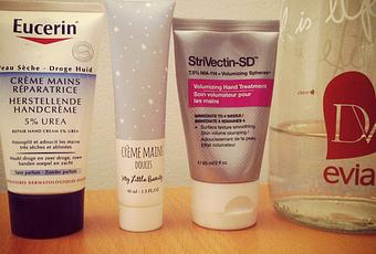 Eucerin - crème mains réparatrice :La marque de parapharmacie est peu attrayante par son pack je vous l'accorde mais très efficace avec notamment ses 5% d'urée. Elle contient aussi du lactate qui, avec l'urée, améliorent activement la capacité d'hydro-fixation de la peau pour une peau bien hydratée et sans tiraillements. Sans parfum et sans colorant, la crème a une texture très douce mais pas vraiment sensorielle à l'application. Mais on oublie très vite ce petit détail puisqu'elle enveloppe les mains d'une douceur incroyable et surtout elle laisse un fini non collant.