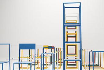 Une table, un tabouret, une chaise, un bibliothèque, toutes réalisées à partir d’une seule tige de fer et une tôle d’acier colorées. Aria tente de travailler sur la notion de « vides« , où chaque pièce dessine le même cube de vide.