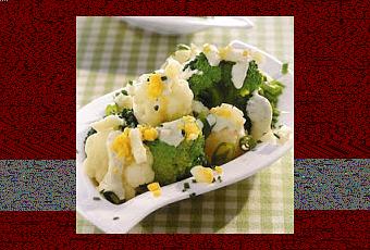 - Ajouter la sauce et les oignons au brocoli et au chou-fleur et mélanger. Laver, égoutter et ciseler la ciboulette. Servir la salade garnie d'œuf dur et de ciboulette.