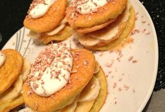 4/ Couper dans le sens horizontale au centre vos petits gateaux, puis sur la base étaler une bonne cuillière de confiture de lait, couper la banane en rondelle fine et les disposer. Replacer l'autre morceau du gâteau sur le dessus.
