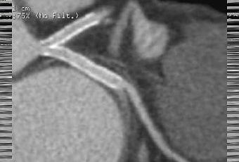 Contrôle systématique d'une angioplatie à 6 mois du tronc commun: resténose non significative (hypodensité intrastent) du stent commun IVA et du stent de la circonflexe proximale. In Annales de Cardiologie et d'Angéiologie Volume 56, Issue 7,December 2008, Pages 359-354